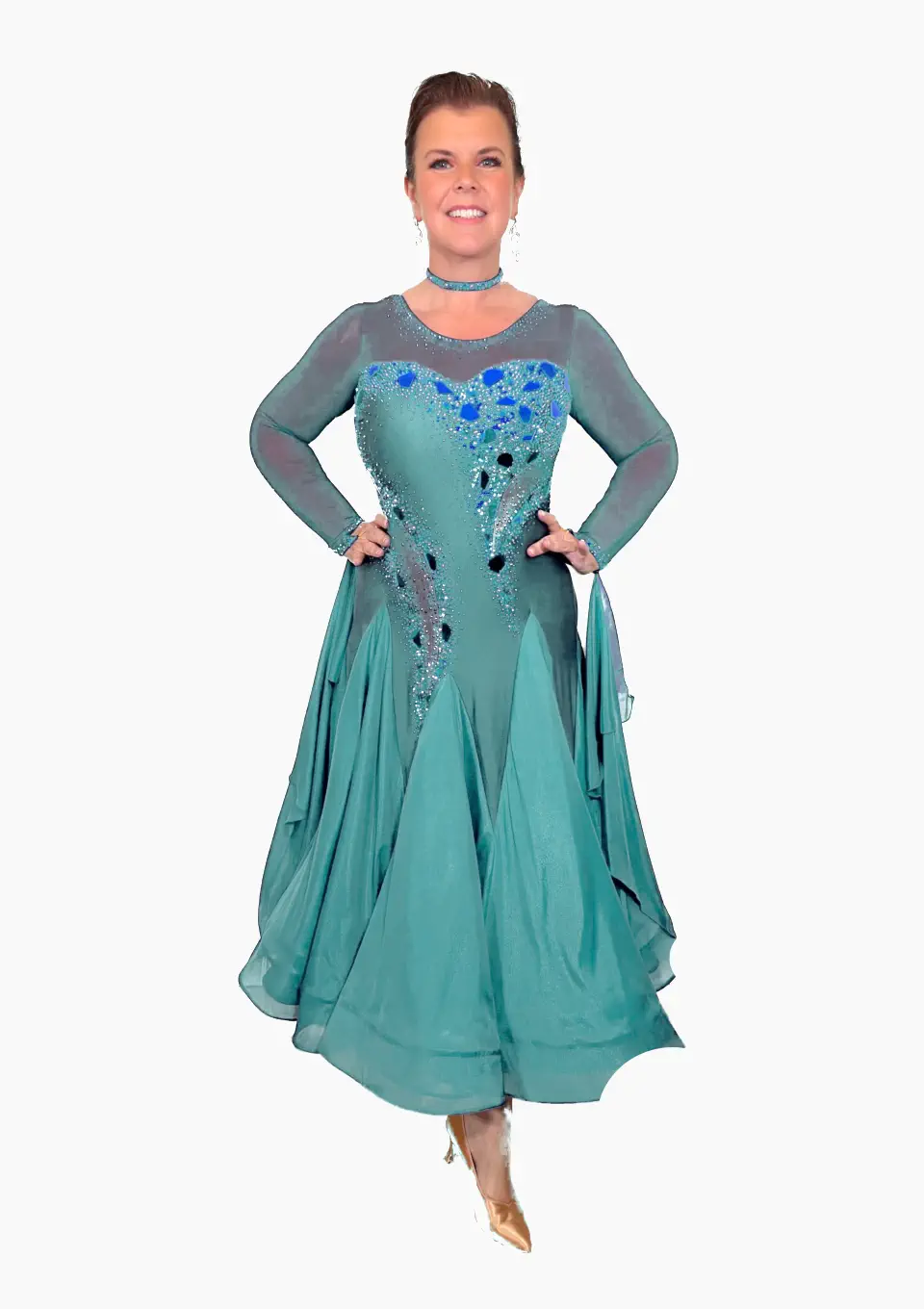 A beautiful ballroom dancing gown in teale with sequins and detachable floats. Stoned in sapphire, light sapphire & royal blue mirrors.